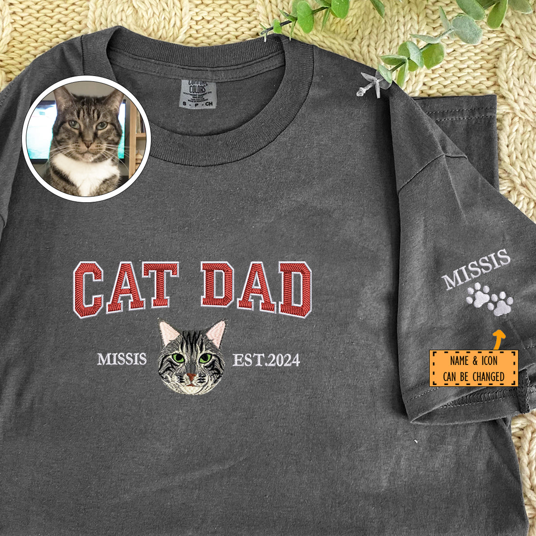 Custom Embroidered T -Shirt, Varsity Cat Dad for Cat Lovers Discover our Custom Embroidered Varsity...